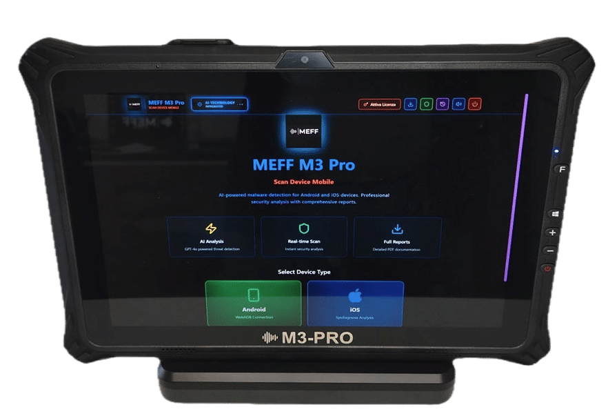 The MEFF M3-PRO is a professional malware scanner for Android and iOS devices. It enables fast and accurate detection of malware, spyware, Trojans, and system anomalies. It is the latest generation malware scanner with built-in Artificial Intelligence for advanced physical scanning of Apple and Android mobile devices.
